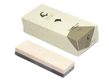 Ardennes-Coticule Slijpsteen Coticule Standaard 125x40mm – Deze 100% natuurlijke “gele” slijpsteen (Coticule Jaune standard) komt uit de Belgische Ardennen. Door een speciale geologische speling van de natuur bevat deze steen zo’n 35-40% granaat. Dit zorgt voor uitstekende slijpeigenschappen. Het is een zeer fijne steen met een vergelijkbare korrelgrootte grid 6000. De Ardennes-Coticule slijpsteen is een niet poreuze slijpsteen die alleen met een beetje water gebruikt moet worden. De slijppasta die ontstaat geeft een ongekend mooi slijpresultaat. De relatief kwetsbare gele steen is verlijmd op een leisteen ondergrond (deze heeft geen slijpfunctie). Het formaat van deze slijpsteen is 125×40 mm.