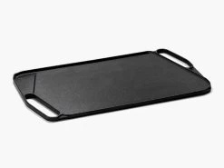 Barebones Cast Iron Griddle Grillplaat – Deze dubbelzijdig te gebruiken, zeer multifunctionele gietijzeren bak-/grillplaat is een must-have voor iedere outdoor cooking liefhebber en onmisbaar in iedere keuken. De ene zijde is glad voor uw gebakken eitje bij het ontbijt, een lunch tosti of wraps, de andere is voorzien van een grill-structuur waar u heerlijk mals vlees of sappige groenten op kan grillen. Voor de vetafvoer is er een brede geul aangebracht waar het vet wordt opgevangen, zo kunt u het later nog gebruiken voor bv. jus. De Griddle bedekt twee gaspitten. Uitstekend geschikt voor zowel indoor als outdoor cooking. Voorzien van twee grote handgrepen is de Griddle solide op te pakken of om te draaien.