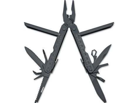 | Gereedschappen | Tang met draadsnijder, glad lemmet, gekarteld lemmet, Phillips kruiskopschroevendraaier, 2x schroevendraaier, multi-moersleutel, houtzaag, vijl, flesopener, blikopener, priem |