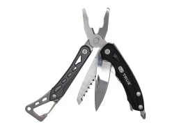 Black Fox BF-200 – Deze klassiek ontworpen multitool is uitgerust met de volgende functies: tang met draadsnijder, glad lemmet, gekarteld lemmet, Phillips kruiskopschroevendraaier, 2x schroevendraaier, multi-moersleutel, houtzaag, vijl, flesopener, blikopener en priem. De lemmeten en gereedschappen zijn vergrendeld. Wordt geleverd met een nylon heuptas.