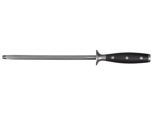 Aanzetstaal 23 cm uit de Diamant Sabatier Integra serie: de nieuwe klassieker. Gesmeed hardverchroomd staal 60 HRC. Heft en stootplaat gesmeed van roestvrij 18/8 edelstaal. Door beide kanten van de snede onder een hoek van 15° over het 23 cm lange aanzetstaal te bewegen wordt uw mes weer scherp. Heftschalen met 3 klinknagels van zeer sterke zwarte POM kunststof. Klasse in techniek en design. In fraaie zwarte geschenkdoos. Levenslange Garantie.