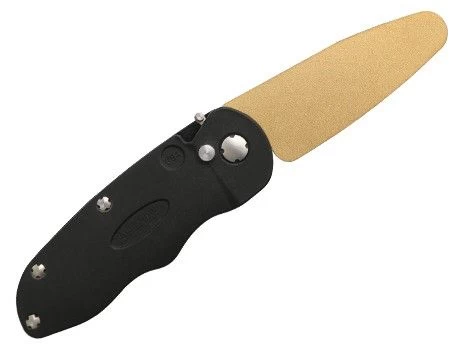 Nieuw deamp;quot;Flipstoneamp;quot; en handige messenslijp-combinatie van diamant en keramiek in zakmesformaat, met een druk op de knop automatisch te openen.