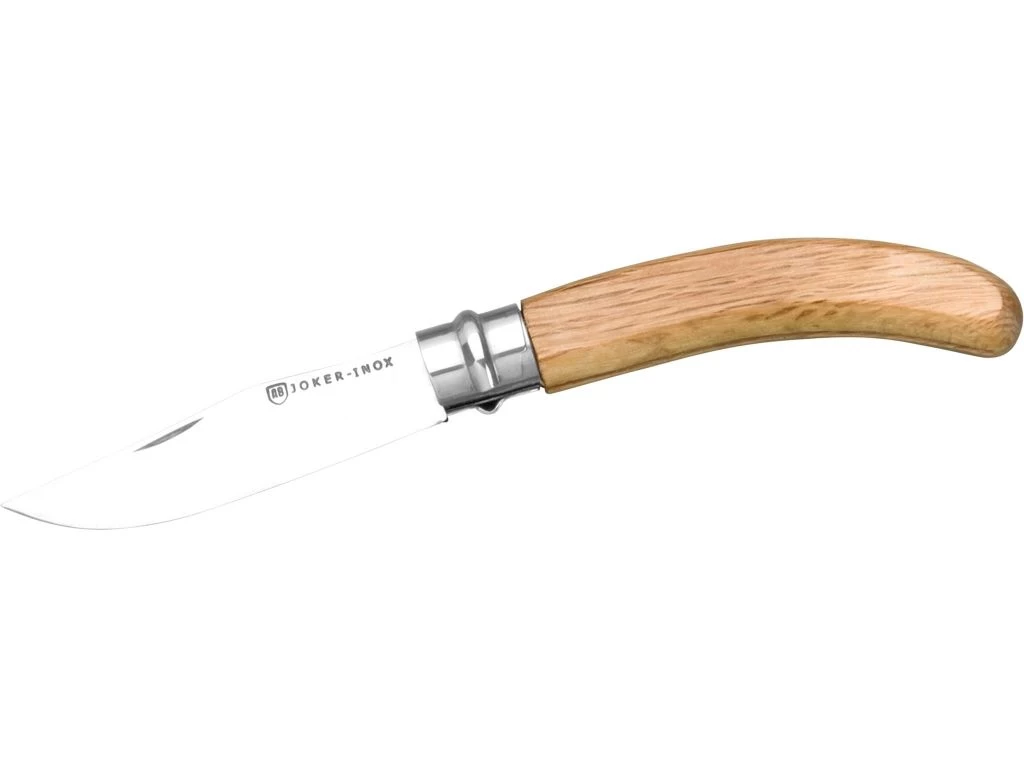Joker Bandolero NE21 Zakmes – De Joker Bandolero NE21 is zakmes met een mooi handvat voor het dagelijks gebruik. Het lemmet is gemaakt van 420 roestvrij staal en wordt door een Viroblock vergrendeld die ook dienst doet als bolster. Om het lemmet te openen is deze voorzien van een inkeping voor de nagel. Het handvat is naar het uiteinde toe licht gebogen en is gemaakt van het mooi generfde lichtbruine steeneik hout.