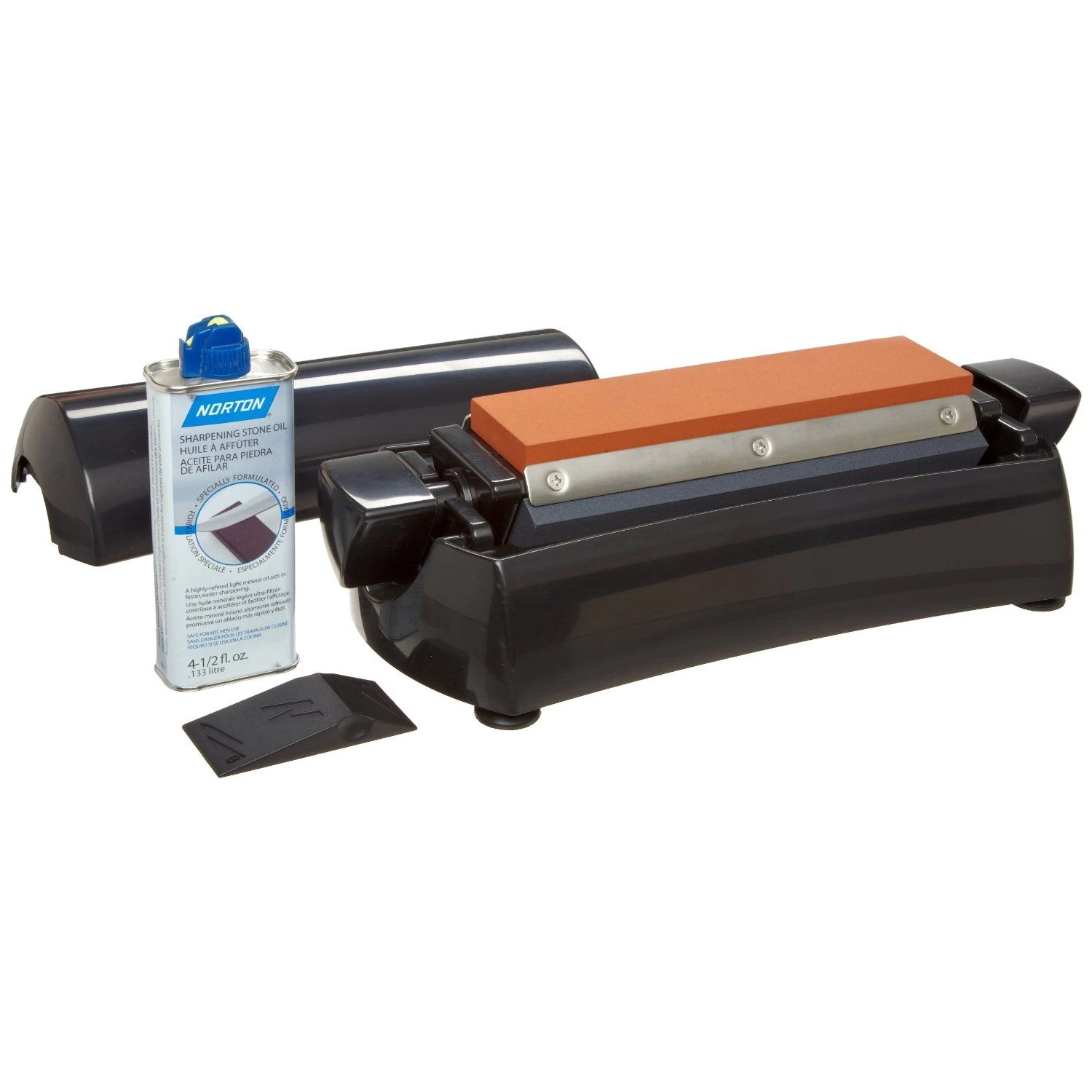 Het Norton Professional Tri Hone Sharpening System bestaat uit 3 slijpstenen van 20 centimeter lengte welke in een zwarte kunststof houder geplaatst zijn. Deze kunststof houder doet tevens dienst als olieopvangbak. Op de zwarte kunststof opvangbak kan het meegeleverde deksel worden geplaatst om alles netjes op te bergen. De meegeleverde 8 Inch grove, middelfijne en fijne olie slijpstenen zijn: (1) fine India, (1) medium Crystolon and (1) coarse Crystolon. Bij de koop is een flesje minerale slijpolie inbegrepen plus een hulpje voor het bepalen van de juiste slijphoek.