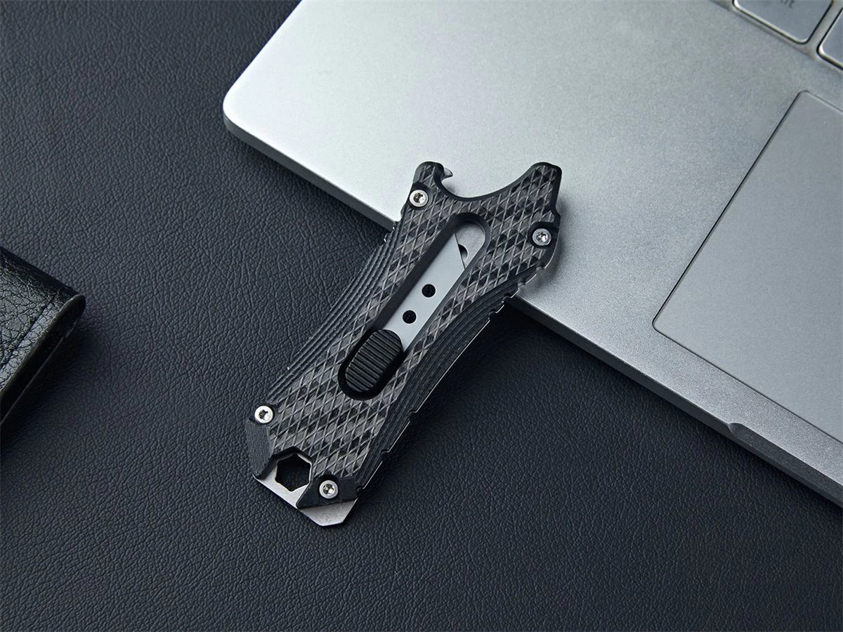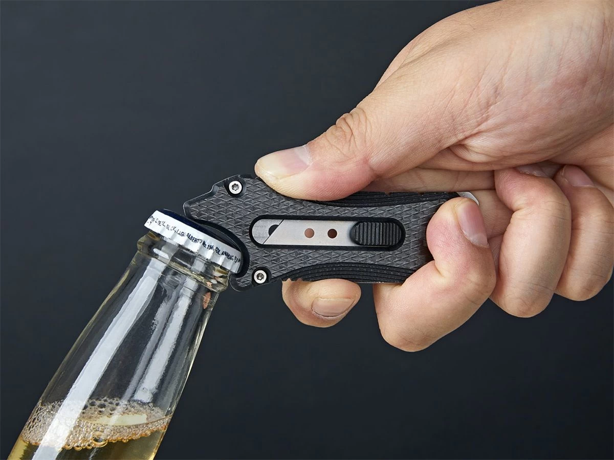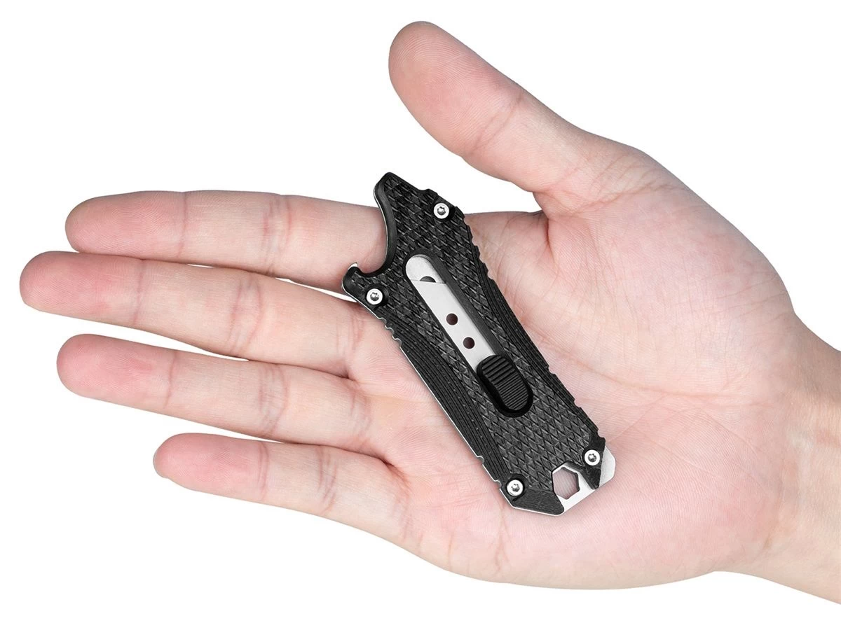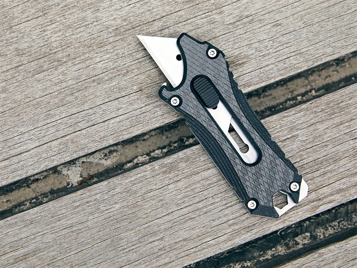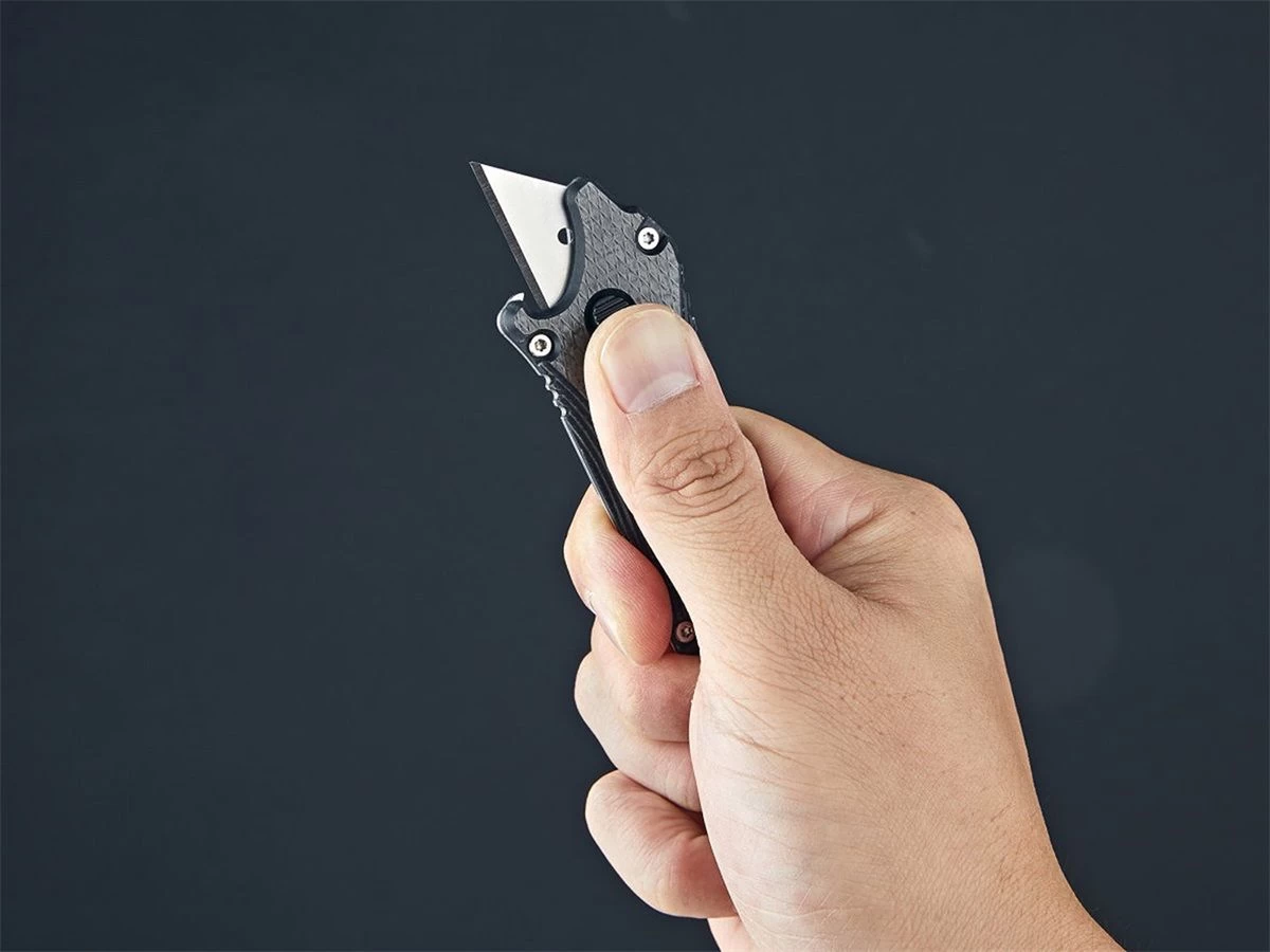Met de soepel werkende zijknop die door een veer ondersteund wordt vergrendel je het mes stevig in 3 standen. Je kunt de lengte van het lemmet regelen om aan je verschillende snijdbehoeften te voldoen. De Otacle accepteert standaard vervangbare mesjes (niet inbegrepen), waardoor het verwisselen van een mesje gemakkelijk is. Het handvat is gemaakt van roestvrij staal aan de ene kant en van koolstofvezel aan de andere kant. Hij is voorzien van een koordoog en dus kun je hem naar hartenlust aan je sleutelbos of rugzak hangen.