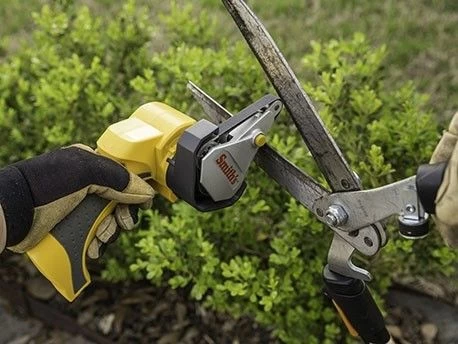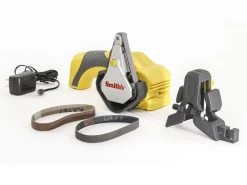 Smith’s Cordless Knife & Tool Sharpener – Smith’s brengt als eerste een draadloze accu slijp(band)machine op de markt die vrijwel al je messen, scharen bijlen etc. eenvoudig kan slijpen, ontbramen of polijsten. Door de instelbare hoekinstelling slijp je jouw mes exact in het gewenste profiel. De twee unieke flexibele verende metalen plaatjes achter de slijpband geven de gewenste tegendruk en voorkomen afwijkingen in het slijpresultaat. Het is voorzien van een afneembare hoekinstelling en een kantelbare slijpband voor bijvoorbeeld het slijpen van bijlen of grasmaaierbladen. Er is een keramische slijper/ontbramer voor kartelmessen aan de zijkant. Deze machine slijpt messen, machetes, snoeischaren, bijlen, grasmachinebladen, scharen, scheppen etc. etc. Het handvat is van kunststof en de machine werkt op één Li-Ion accu (7.2V). Doordat er geen snoeren zijn heb je dus veel vrijheid van bewegen.