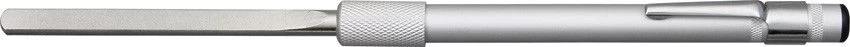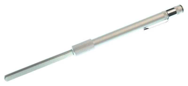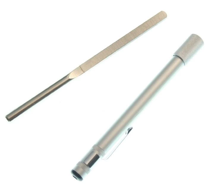 Super Shirt Pocket Sharpener / Pen-vormige diamantslijpsteen – Deze pen-vormige diamantslijpsteen heeft een uitschuifbare diamant slijpsteen met een half ronde kant voor het slijpen van grove gekartelde messen. Het heeft een vlakke kant voor het slijpen van gladde messen en het heeft een groef voor het slijpen vishaken. De uitschuifbare diamant slijpstaaf wordt opgeborgen in een zilverkleurige aluminium houder welke voorzien is van een clip om hem bijvoorbeeld in je borstzak te bewaren. Hij weegt 45 gram en is uitgeschoven 22 centimeter lang, wat genoeg is om er goed mee te kunnen slijpen. Ingeschoven is jij slechts 14 centimeter lang.