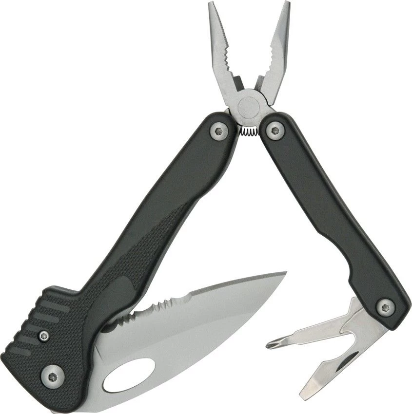 Tool Logic SL Tang. 4 1/8 “gesloten Framelock. Gedeeltelijk gekarteld 8Cr15MoV high carbon roestvrij lemmet met de duim gat trekken. Zytel en RVS handgrepen voorzien van plat en kruiskop schroevendraaier en flesopener. Aparte handvatten om veer precisietangen met draadsnijder onthullen.