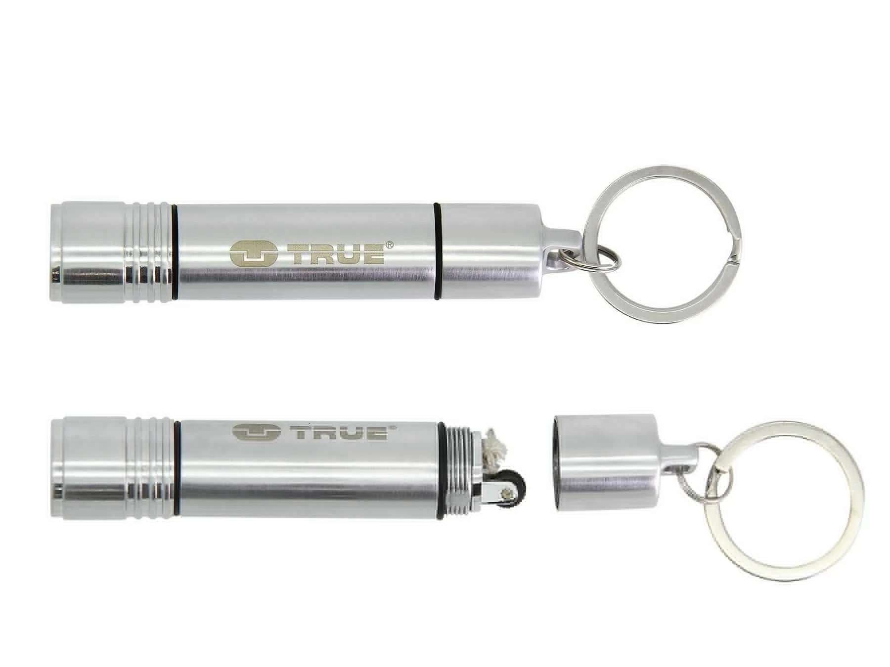 True Utility Firelite in Clamverpakking – Mini sleutelhanger zaklamp en een navulbare aansteker. De FireLite herbergt een ​​full-size Fire Stash aansteker onder de dop aan het uiteinde van de slanke en stijlvolle geborstelde aluminium behuizing! Met een eenvoudige draai aan de kop is dit heldere in te schakelen.