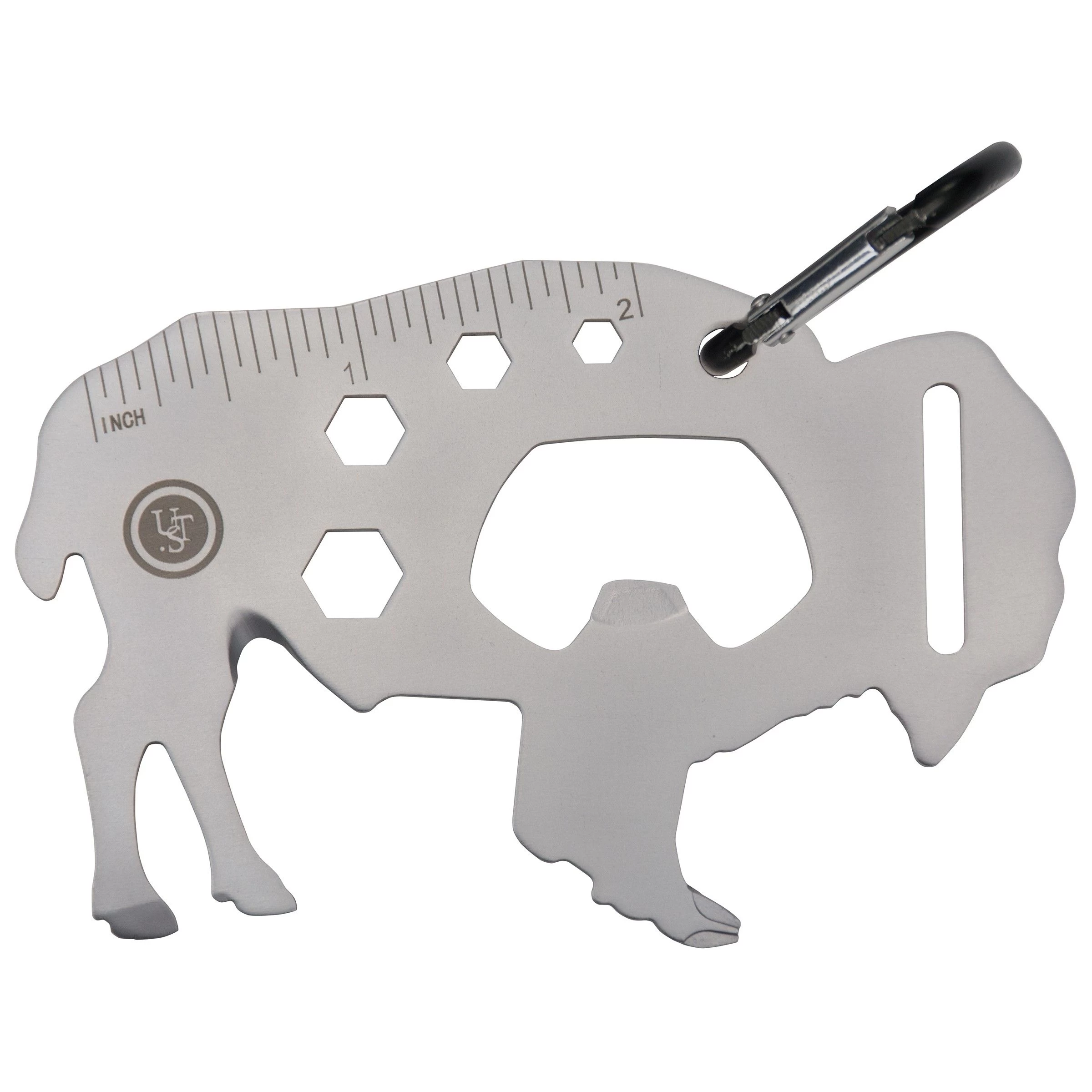 UST Buffalo Tool A Long Multi-Tool – Dit is een roestvrijstalen multitool van UST in zakformaat die de vorm heeft van een bizon. Hij is ontworpen om een verscheidenheid aan outdoor taken buitenshuis of onderweg uit te voeren. Met de aanwezige karabijnhaak kun je de tool gemakkelijk aan je riemlus of rugzak hangen. Daarnaast is deze multitool TSA-compliant voor veilig reizen. De tool is voorzien van de volgende gereedschappen: liniaal, vlinder moersleutel, flesopener, kruiskopschroevendraaier, moersleutel (4 formaten), platte schroevendraaier, koordsnijder en karabijnhaak.