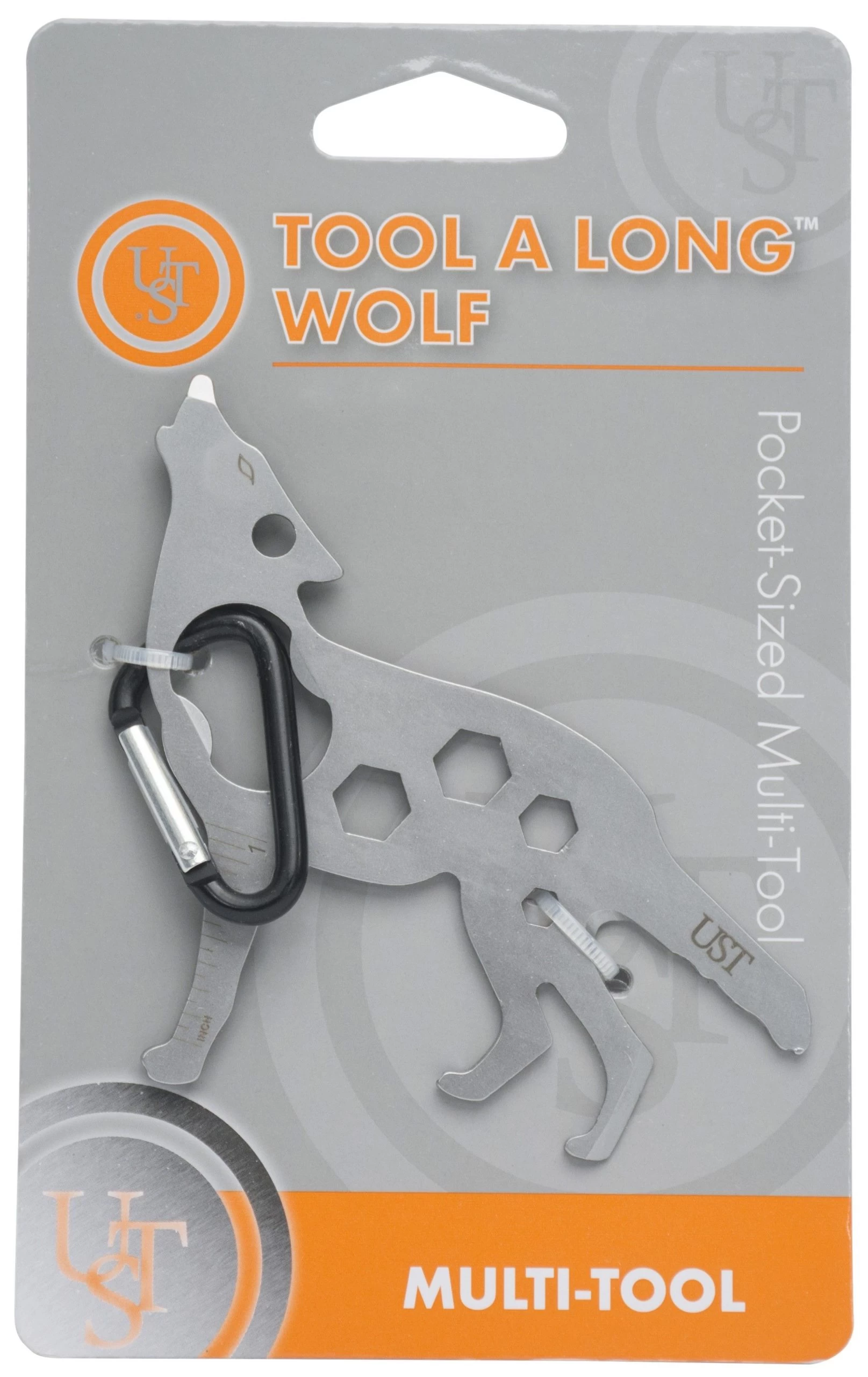 UST Wolf Tool A Long Multi-Tool – Dit is een roestvrijstalen multitool van UST in zakformaat die de vorm heeft van een wolf. Hij is ontworpen om een verscheidenheid aan outdoor taken buitenshuis of onderweg uit te voeren. Met de aanwezige karabijnhaak kun je de tool gemakkelijk aan je riemlus of rugzak hangen. Daarnaast is deze multitool TSA-compliant voor veilig reizen. De tool is voorzien van de volgende gereedschappen: moersleutel (4 formaten), koordsnijder, krabber, liniaal, flesopener en karabijnhaak.