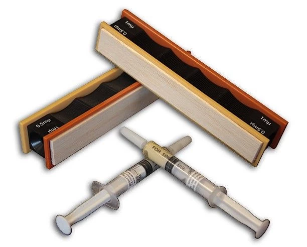 Elke set bevat twee kunststof basisstenen met ieder twee strops, twee soorten diamant polijstpasta (14 en 10) en spuiten, goed voor 8 tot 9 toepassingen en elke toepassing zou moeten werken voor 30 tot 40 slijpsessies. De injectiespuiten zorgen voor een schone en gemakkelijke toepassing op uw strops.