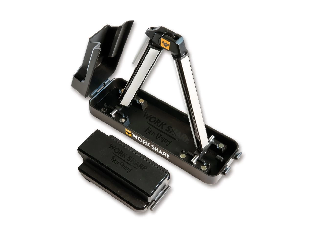 Work Sharp Angle Set Knife Sharpener – De Work Sharp Angle Set Knife Sharpener is ontworpen door Ken Onion. Het is een verstelbare messenslijper die zeer veelzijdig is met drie verschillende korrels en vijf verschillende slijphoeken. De draaibare staven zijn voorzien van een grof diamant slijpvlak in korrel 400, een fijn diamant slijpvlak in korrel 800, en een extra fijn keramisch slijpvlak voor fijn polijsten. De slijphoek kan worden ingesteld op 15°, 17,5°, 20°, 22,5° of 25°. Met de extra conische keramische slijper kunnen ook messen met een gekartelde snede snel worden opgeknapt. De Angle Set Knife Sharpener kan handig worden opgevouwen en opgeborgen.
